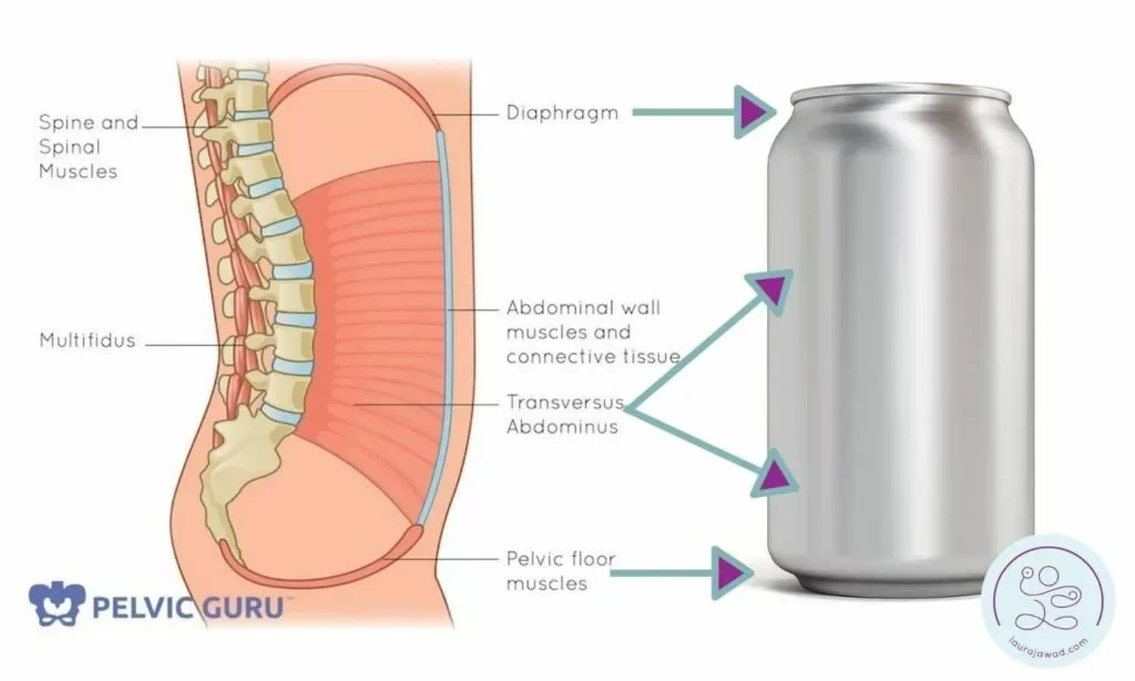 Think of it like a canister. The diaphragm sits at the top. The pelvic floor sits at the bottom, and your deep abdominals wrap around the middle.
